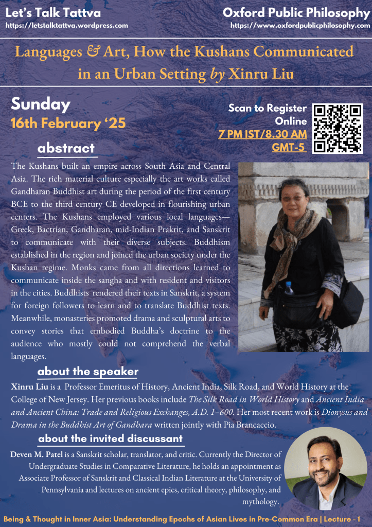 Prof. Liu’s lecture is the first of the lecture series — Understanding Epochs of Asian Lives in Pre-Common Era — jointly pursued by Let’s Talk Tattva and Oxford Public Philosophy. Prof. Xinru Liu, Professor Emeritus of History, Ancient India, Silk Road and World History at College of New Jersey talks about the Kushan dynasty along historical, geographical, religious and cultural axes. Prof. Liu draws on various kinds of sources to animate the life-world of the Kushans, that enable us to think closely about the impact of their rule onto the thought-schema of successive life-worlds as well as, with some sound reasoning, onto the formation of certain traditional conceptual frameworks. Dr. Deven M. Patel who, thanks to the effort of team Oxford Public Philosophy and Kas in particular for connecting all of us, joined Prof. Liu to discuss the vibrant material culture of the Kushans and its consequent cultural reverberations across territorial and cultural boundaries. Dr. Patel is an Associate Professor of Sanskrit Language and the Literatures of South Asia.